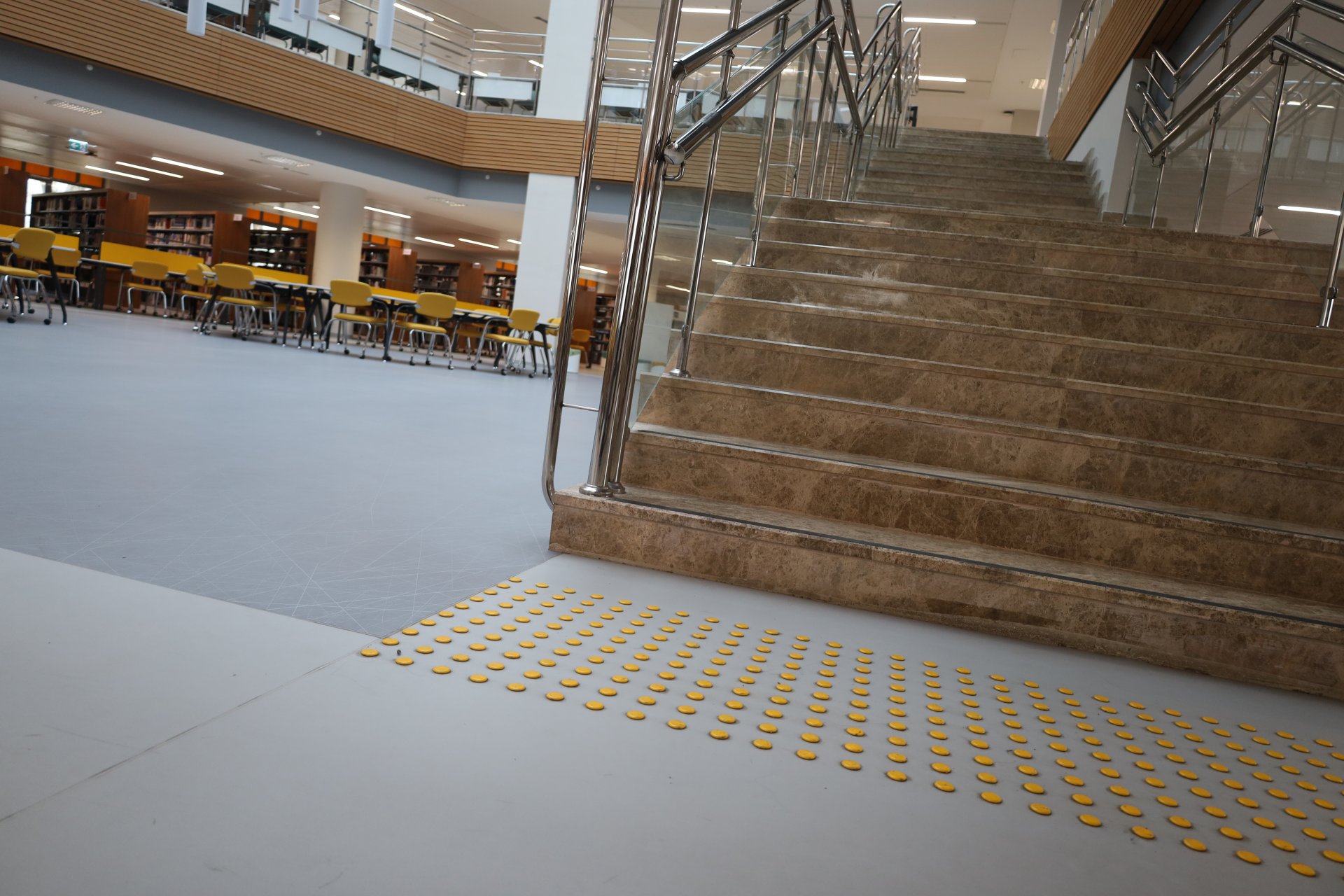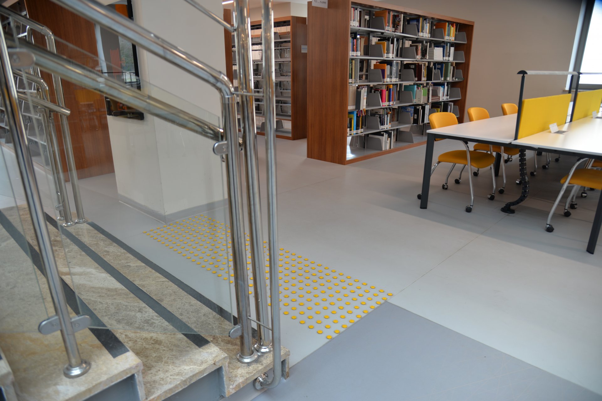 Kütüphane İçi Katlar Arası Kaymaz Şeritli Basamaklar ve Görme Engelli Hissedilebilir Zemin